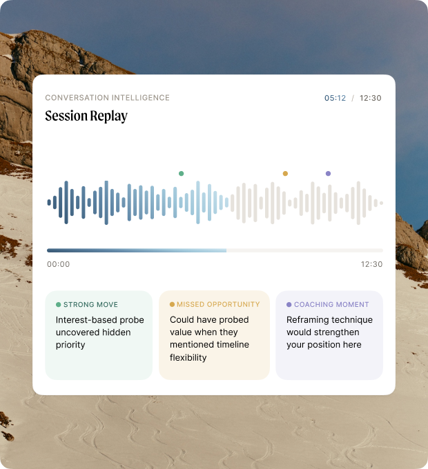 Simulated counterparties that surface your blind spots before the real conversation does. Practice under pressure. Refine in real time.